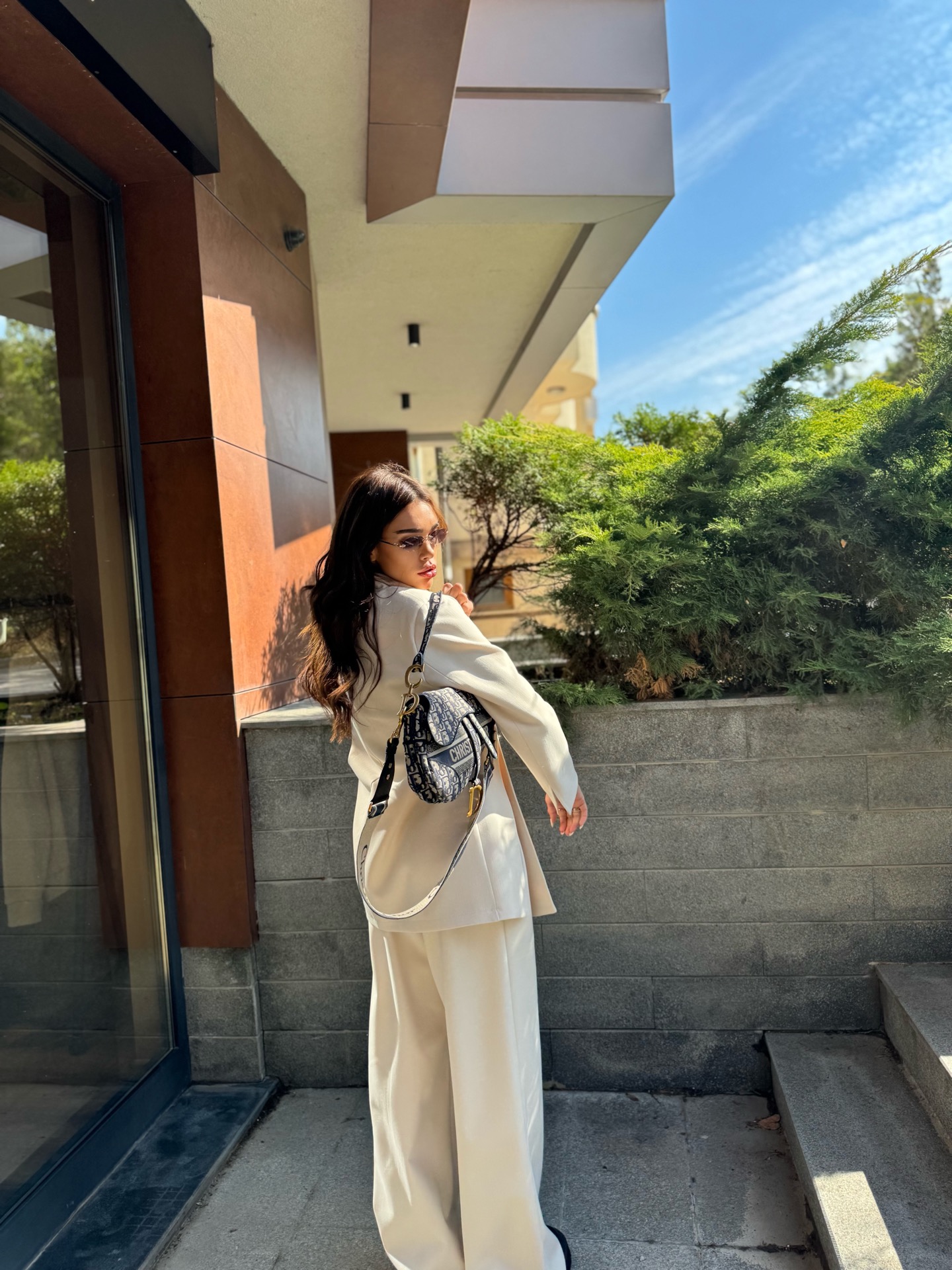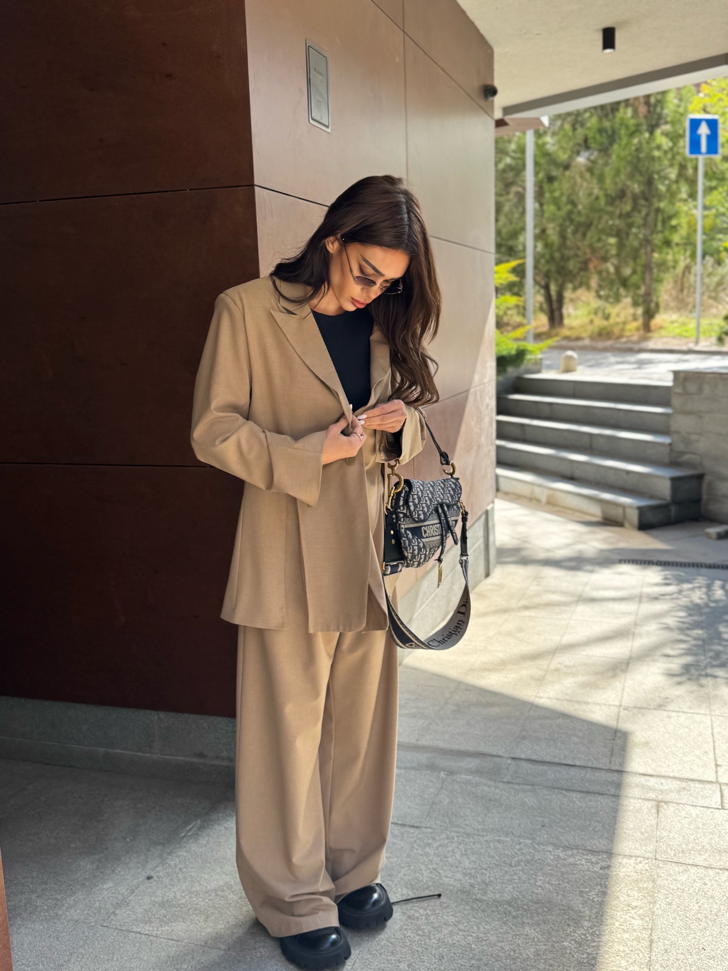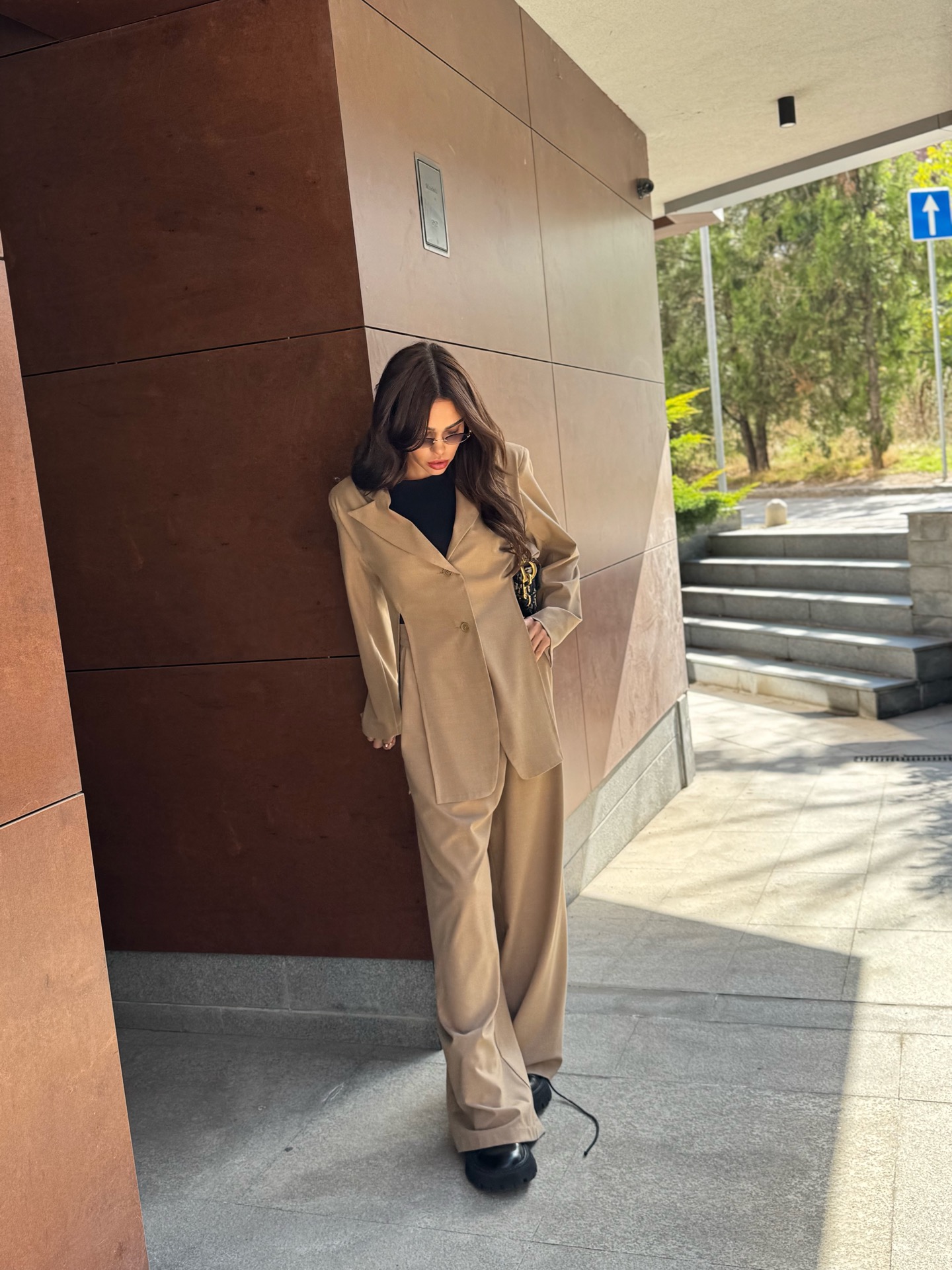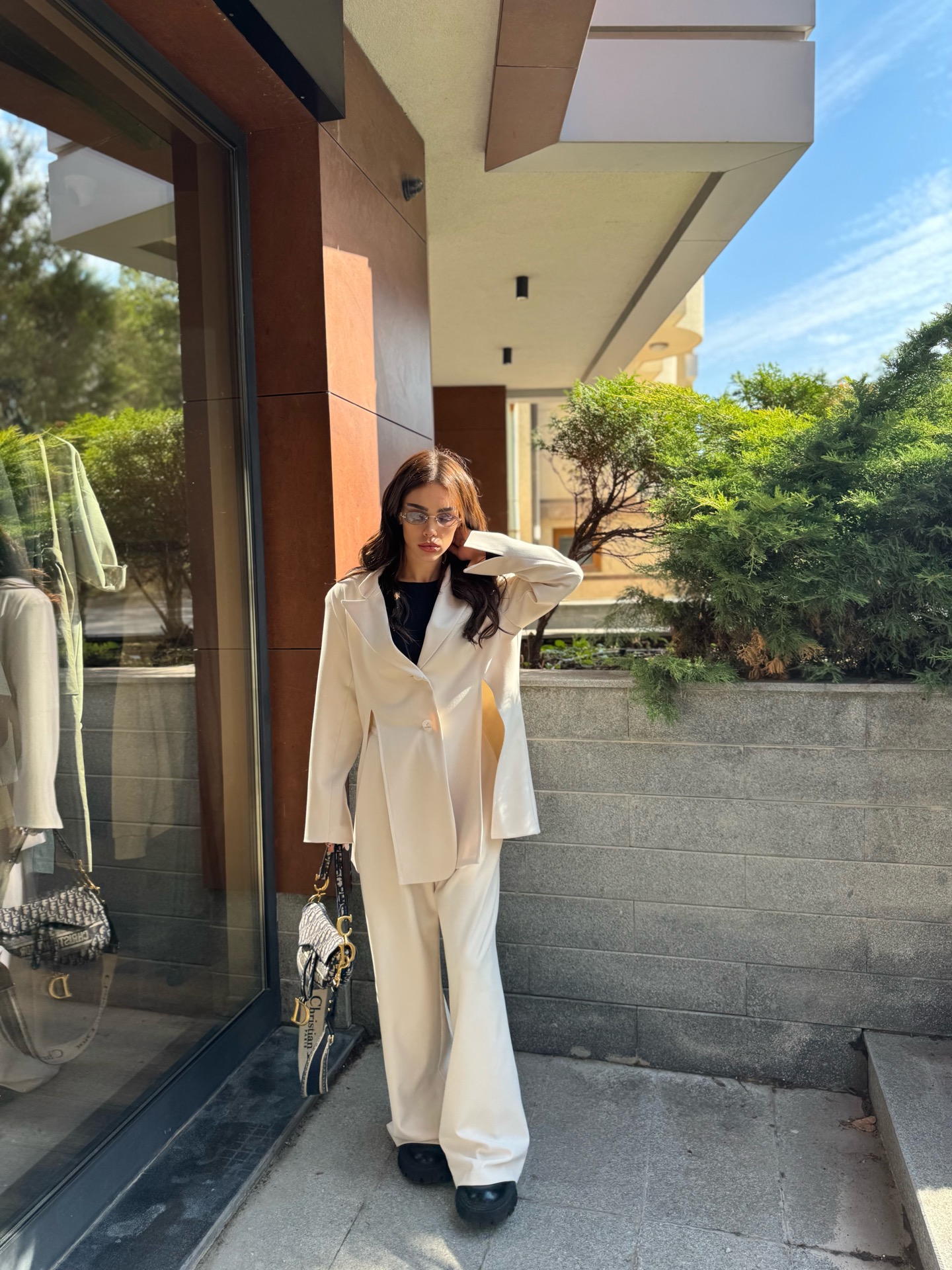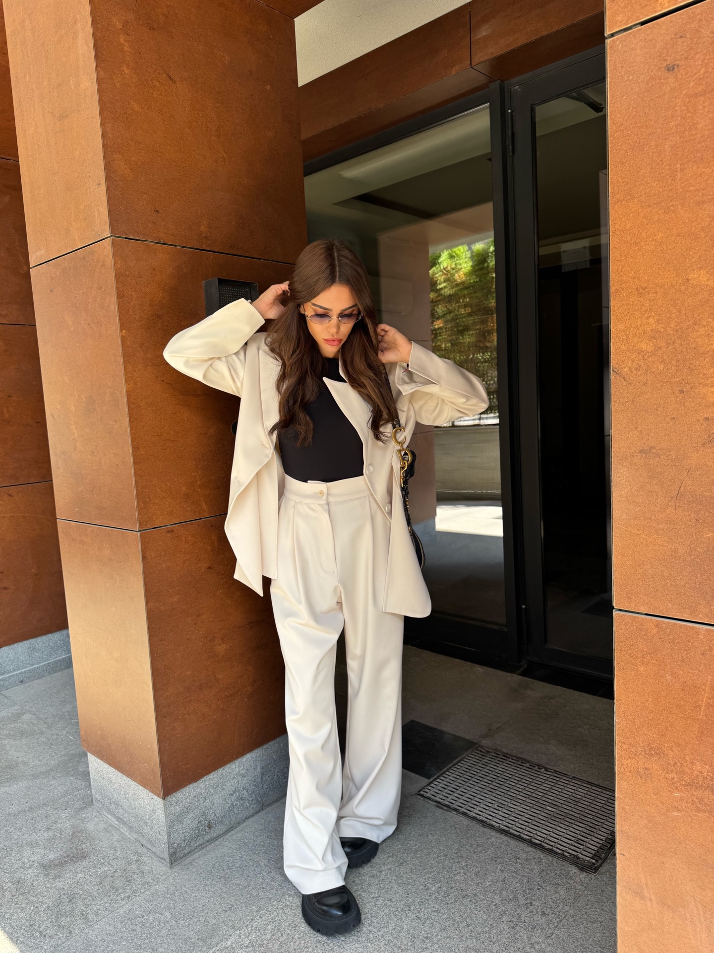 Сет сако с дълъг ръкав, цепки от талията надолу, закопчаване с 2 копчета; панталон с разкроени крачоли, висока талия с ластичен набор.